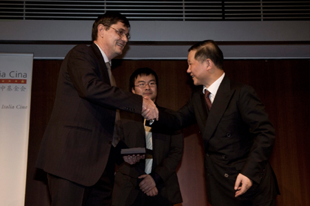 中國駐意大利大使孫玉璽先生為橫店集團(tuán)歐洲分公司——HGE的總經(jīng)理PIVA先生頒獎。PIVA先生在受獎儀式上介紹了橫店集團(tuán)的國際化戰(zhàn)略和在多個領(lǐng)域的國際領(lǐng)先地位,并表示橫店集團(tuán)在醫(yī)療、教育上今后還將會有更大的投入。(孫玉璽在給HGE的總經(jīng)理PIVA頒獎。)